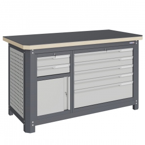 Верстак серии MECHANIC: MCN 1552.S9L5 состоит из столешницы шириной 1493 мм, рамы верстака, состоящей из опор, перемычек, боковых перфопанелей, малого модуля S9 большого модуля L5.