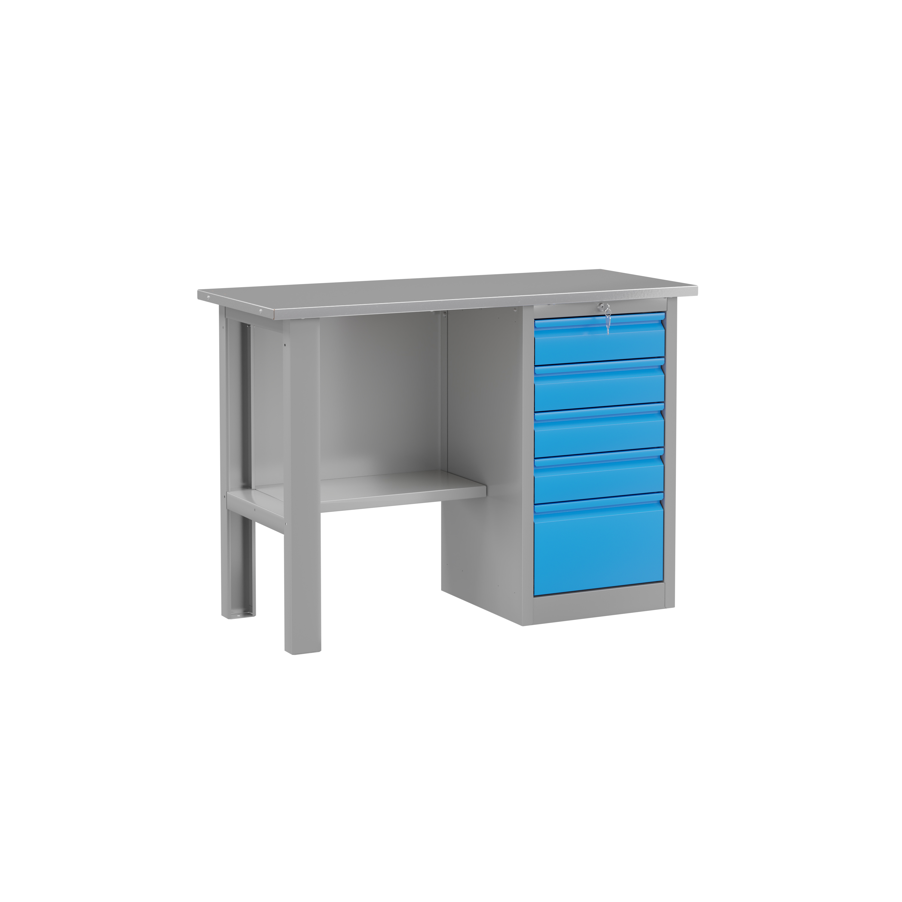 Верстак создаст для вас удобное рабочее место: в комплектации имеется одна большая тумба, нижняя полка. Тумба имеет пять ящиков, которые используются для удобного складирования инструментов.