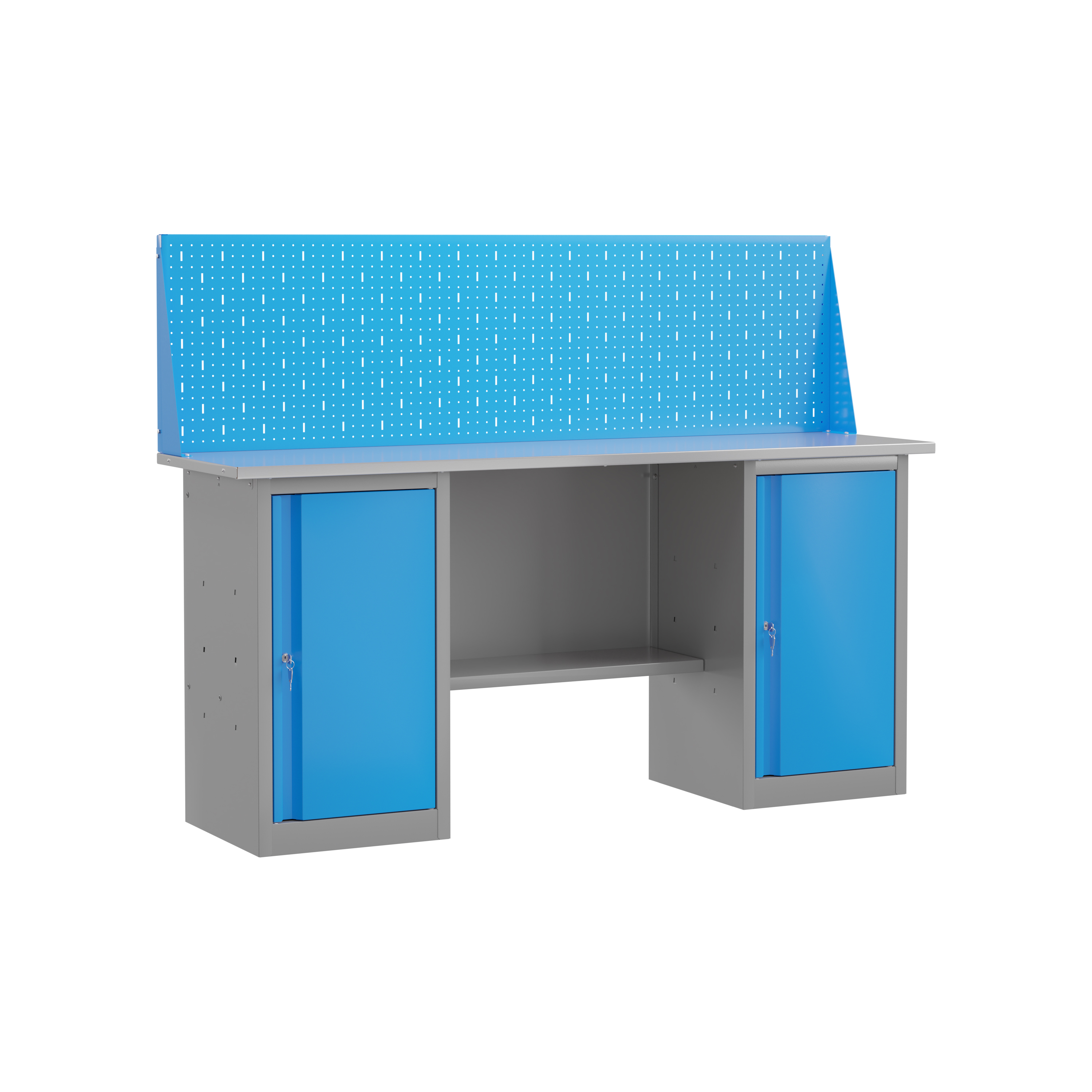 Столешница верстака закреплена на двух вместительных тумбах с дверцами. Тумбы оснащены полками, на которых можно хранить рабочие инструменты, запасные детали и материалы. Для надёжной сохранности инвентаря и деловой документации на дверцах предусмотрена возможность закрепления замочка.