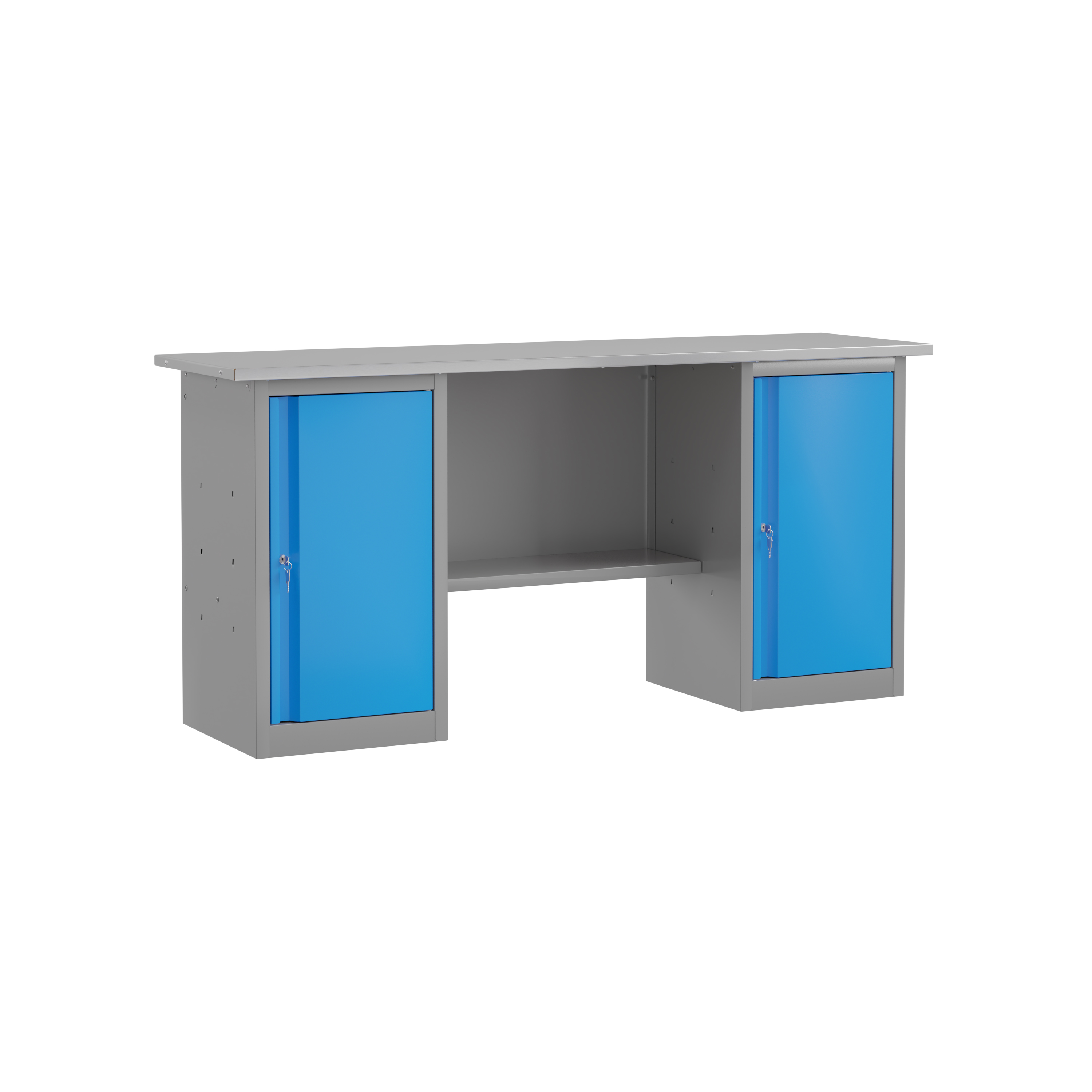 Модель оснащена двумя объемными тумбами, которые разделены на две полки внутри. Каждая тумба имеет замок для надежного хранения инструментов. Между тумбами внизу располагается полка для складирования больших по размерам предметов.