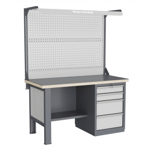 Верстак может комплектоваться одинарным или двойным перфорированным экраном, электромонтажным блоком для установки розеток и дополнительных устройств, а также комплектом освещения с держателем и лампой. Перфорация экрана подходит под стандартные держатели для инструментов, отверток, крючков, полок. Возможна комплектование верстака навесным элементами (держатели, крючки, полки).