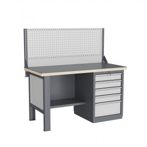 Верстак может комплектоваться одинарным или двойным перфорированным экраном, электромонтажным блоком для установки розеток и дополнительных устройств, а также комплектом освещения с держателем и лампой. Перфорация экрана подходит под стандартные держатели для инструментов, отверток, крючков, полок. Возможна комплектование верстака навесным элементами (держатели, крючки, полки).