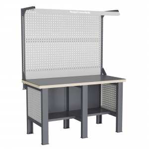 Верстак может комплектоваться одинарным или двойным перфорированным экраном, электромонтажным блоком для установки розеток и дополнительных устройств, а также комплектом освещения с держателем и лампой. Перфорация экрана подходит под стандартные держатели для инструментов, отверток, крючков, полок. Возможна комплектование верстака навесным элементами (держатели, крючки, полки).