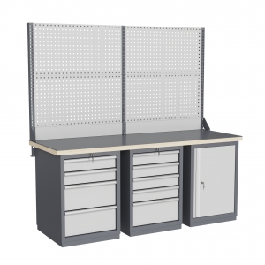Верстак может комплектоваться одинарным или двойным перфорированным экраном, электромонтажным блоком для установки розеток и дополнительных устройств, а также комплектом освещения с держателем и лампой. Перфорация экрана подходит под стандартные держатели для инструментов, отверток, крючков, полок. Возможна комплектование верстака навесным элементами (держатели, крючки, полки).