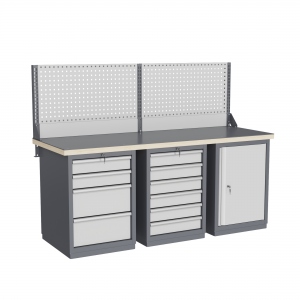 Верстак может комплектоваться одинарным или двойным перфорированным экраном, электромонтажным блоком для установки розеток и дополнительных устройств, а также комплектом освещения с держателем и лампой. Перфорация экрана подходит под стандартные держатели для инструментов, отверток, крючков, полок. Возможна комплектование верстака навесным элементами (держатели, крючки, полки).
