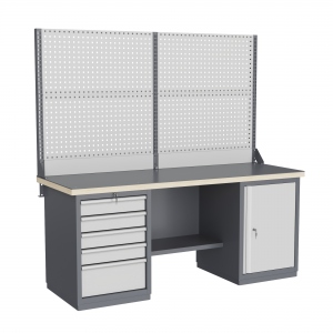 Верстак может комплектоваться одинарным или двойным перфорированным экраном, электромонтажным блоком для установки розеток и дополнительных устройств, а также комплектом освещения с держателем и лампой. Перфорация экрана подходит под стандартные держатели для инструментов, отверток, крючков, полок. Возможна комплектование верстака навесным элементами (держатели, крючки, полки).