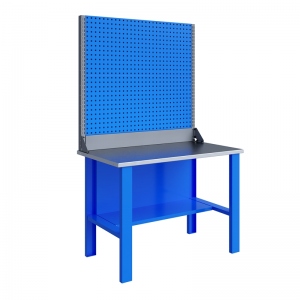 Верстак комплектуется полкой-стенкой, расположенной под столешницей для удобного размещения габаритного инструмента и оснастки.
