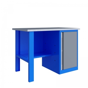Тумба верстака - сварная.В тумбе P7 установлено две полки. Полки устанавливаются на парах специальных формованных зацепов, выполненных в боковых стенках тумбы. Имеется возможность смены стороны открывания двери. Дверь тумбы снабжена центральным замком с поворотом ригеля 180 градусов. В комплекте имеется два ключа.