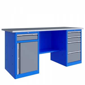 Тумбы верстаков выполнены сварными. Ящики в тумбах устанавливаются на шариковых телескопических направляющих полного выдвижения. В тумбе P4 установлено два малых и два больших ящика. Внутренние размеры малых ящиков (ВхШхГ), не более: 103 х 397 х 520 мм. Внутренние размеры больших ящиков (ВхШхГ), не более: 222 х 397 х 520 мм. Тумбы с ящиками снабжены общим центральным замком с поворотом ригеля 180 градусов и подпружиненной тягой. В тумбе P8 установлен малый ящик и имеется отделение с дверью и одной полкой. Ящик снабжен центральным замком с поворотом ригеля 180 градусов и подпружиненной тягой. Полка устанавливается на парах специальных формованных зацепов, выполненных в боковых стенках тумбы. Имеется возможность смены стороны открывания двери. Дверь тумбы снабжена центральным замком с поворотом ригеля 180 градусов. В комплекте имеется два ключа с каждым замком.